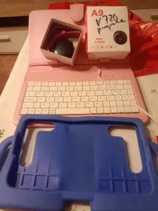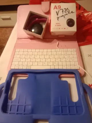 Funda rosa para tablet de 7 pulgadas, con teclado integrado. - Diseño tipo libro. - Teclado blanco. - Incluye un ratón negro.