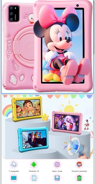 Tablet diseñada para niños, con un tamaño de pantalla de 7 pulgadas. Incluye una funda protectora. - Pantalla de 7 pulgadas. - Funda protectora integrada. - Diseñada para niños.