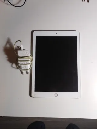 Tablet Apple iPad en color blanco. - Pantalla de 9.7 pulgadas. - Cámara frontal y trasera. - Botón de inicio.