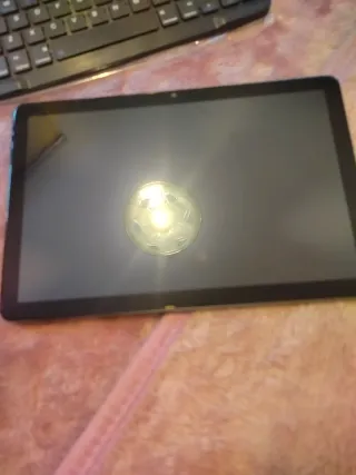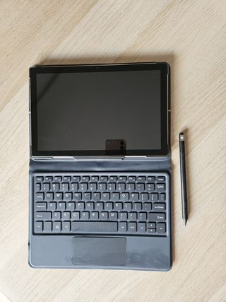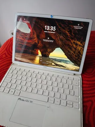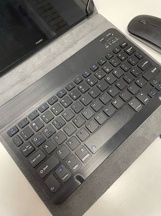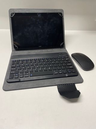 Tablet Huawei en color negro y gris, con funda teclado y ratón inalámbrico. - Pantalla de 10 pulgadas. - Teclado QWERTY en español. - Ratón óptico. - Funda protectora. - Algunas rayadas. - Perfecto funcionamiento - Teclado con imán y bluetooth