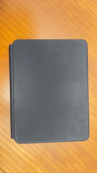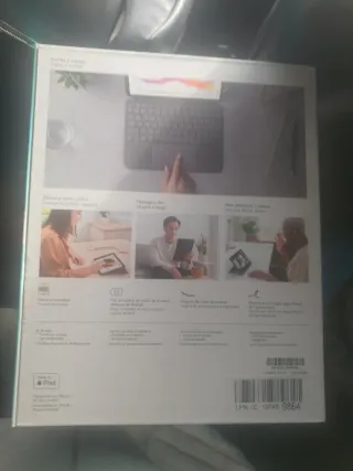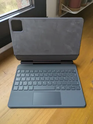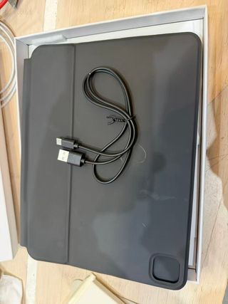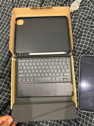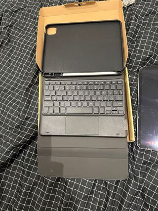 Funda con teclado para iPad Pro 11 pulgadas. Está nueva a estrenar porque no nos viene a nuestro IPad. Viene de Amazon Estados Unidos por lo que cuesta más devolverla. Lleva luz el teclado y la pantalla es rotativa. Es inalámbrico y se carga con cable tipo C.