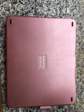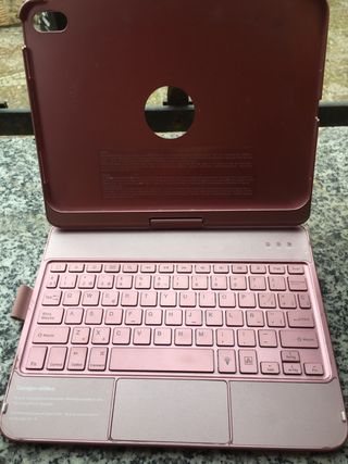Funda protectora con teclado integrado para iPad. Color rosa. - Teclado QWERTY en español. - Conexión Bluetooth. - Trackpad integrado. Marcas de uso. Se carga con usb C Desconozco para que modelo de Ipad es, mirar fotos con medidas. Es par Ipad, pero no es marca Apple