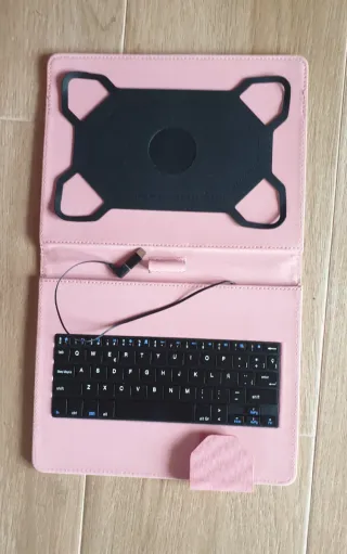 Funda protectora de color rosa para tablet, con teclado integrado. - Diseño con soporte para la tablet. - Teclado con conexión. - Material exterior tipo piel. Prácticamente nueva.Funda y teclado de la marca SUBBLIM, diseñada en España y con teclado en español, con la Ñ. Con micro USB, y funciones especiales: fn. Exclusivo sistema de sujeción segura y cierre magnético. Color coral Tamaño:262 x 197 x 30 mm. En su caja