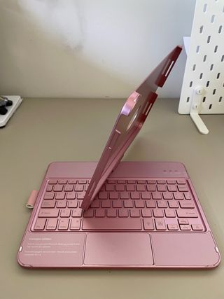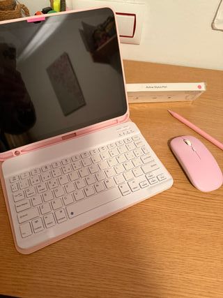 Funda con teclado en color rosa para iPad. Protege tu dispositivo y escribe cómodamente. - Diseño elegante en color rosa. - Teclado integrado para mayor productividad. - Compatible con iPad 11 pulgadas (10,9) - Cargador USB C - Teclado español - Se conecta por bluetooth - Las teclas se pueden iluminar