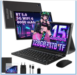 Tablet JUEDUR en color negro con pantalla de 10 pulgadas. Cuenta con conectividad BT 5.0 y WiFi 6, además de una batería de 8000 mAh. - 22GB de RAM. - 128GB de almacenamiento interno. - Soporte para tarjeta TF de hasta 1TB. - Incluye teclado y ratón.
