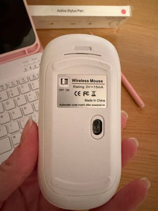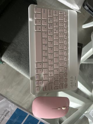 Conjunto de accesorios para iPad. - Teclado blanco. - Ratón inalámbrico rosa. - Lápiz táctil rosa.