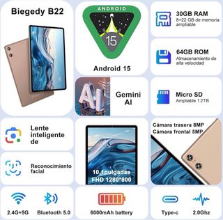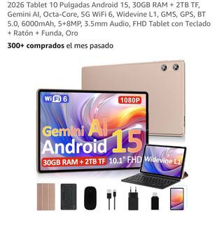 NUEVO EN SU CAJA SIN ESTRENAR. IDEAL PARA REGALO. Tablet Gemini AI 15 en color dorado, con pantalla de 10.1 FHD. - 30GB RAM + 2TB TF - Android 15 - Octa-Core, 5G WiFi 6 - Widevine L1, GMS, GPS, BT 5.0 - Batería 6000mAh - Cámaras 5+8MP - Incluye Teclado, Ratón y Funda