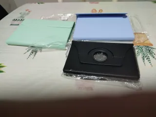 Se vende lote de tres fundas para tablet, cada una con teclado integrado. Los colores disponibles son verde menta, azul claro y negro. - Funda verde menta. - Funda azul claro. - Funda negra con teclado giratorio.