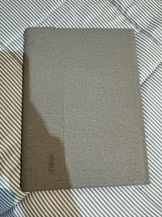 Funda protectora para tablet con teclado integrado. - Diseño elegante en color gris y marrón. - Teclado QWERTY en español. - Cierre seguro para proteger el dispositivo.