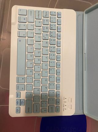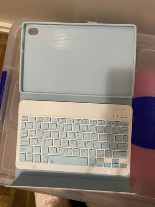 Funda protectora para tablet con teclado integrado. Diseño ligero y funcional. Lo vendo porque lo utilice un día solo, funciona bien y conecta bien. - Color azul claro. - Teclado blanco y azul. - Material resistente. Precio en tienda 35,90€