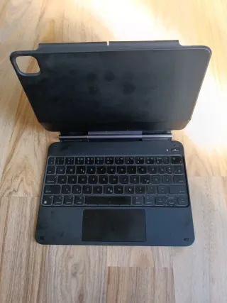 Funda protectora con teclado integrado para ipad Air de 13 pulgaras. En perfecto estado y con embalaje original. - Diseño elegante en color gris. - Teclado retroiluminado. - Trackpad multitáctil. - Soporte ajustable para visualización. Tiene la letra V un poco floja, depende de como pulses se mueve un poquito, es el único defecto que tiene. Precio original 255€