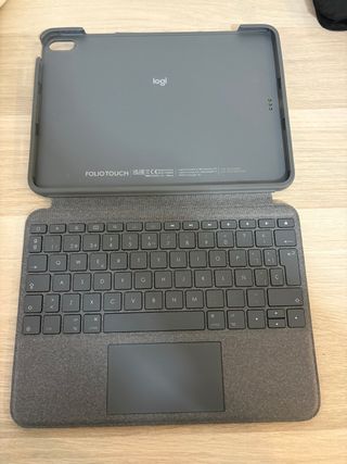 Funda con teclado y trackpad para iPad Air (4ª y 5ª generación). - Teclado retroiluminado. - Trackpad integrado. - Conexión Smart Connector Teclado Logitech Folio Touch para iPad Air de 4ª y 5ª generación. ヘ Está prácticamente nuevo pero TIENE UN ERROR DE CONEXIÓN EN EL TECLADO, a veces se conecta y a veces no, por eso su precio. Aún así es una muy buena funda protectora y para poder poner el iPad en vertical en diferentes inclinaciones. Se aceptan ofertas. PVP: 189,99€