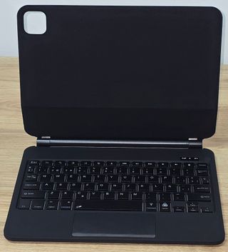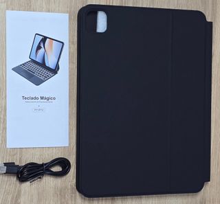 Teclado negro para iPad de 11 pulgadas. Diseño elegante y funcional. - Teclado QWERTY en español. - Trackpad integrado. - Conexión Bluetooth. Abierto para verificarlo y para las fotos.