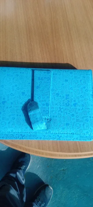 Funda protectora para tableta de 10 pulgadas. Su diseño es azul y tiene un relieve con dibujos. Incluye teclado extraible - Cierre con tira. - Incluye una etiqueta decorativa.