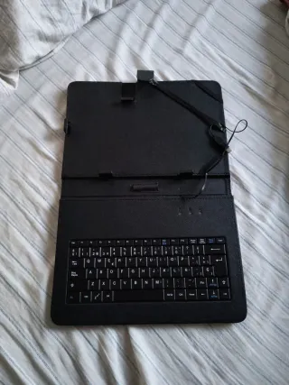 Teclado con funda para tablet, en color negro. Se encuentra en buen estado. - Incluye teclado y funda protectora. - Diseño elegante y compacto. - Perfecto para escribir cómodamente. Tiene al pequeño desperfecto