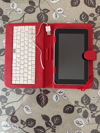 Funda protectora para tablet con un teclado integrado y conexión USB. La funda es de color rojo. La pantalla esta dañada por el lado derecho pero no afecta al LCD de la pantalla. - Teclado QWERTY con disposición española. - Conexión USB para fácil compatibilidad. - Material exterior resistente.