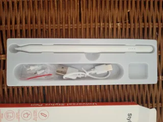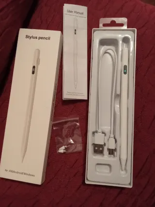 Lápiz digital blanco para tablet, ideal para tomar notas o dibujar. Al comprarlo me di cuenta de que no es compatible con mi tablet. Está nuevo. Es compatible con iOS, android y windows. - Incluye cable de carga USB tipo C. - Viene con dos puntas de repuesto. Detalles: Se carga en 25 minutos y tiene una autonomía de entre 4 y 8 horas.
