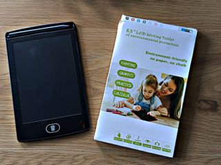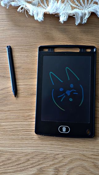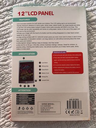 Tablet de escritura LCD de 6.5 pulgadas, en color negro. Está nueva a estrenar. - Ideal para dibujar, practicar calculo o escritura. - Superficie LCD para escritura sin papel ni tiza. - Incluye lápiz táctil integrado. - Botón de borrado fácil de usar. Tiene un botón trasero con el que poder bloquear los dibujos o escritura y no se borren, ideal para dejar notas. Super ligera, no pesa nada. Dado su tamaño compacto se puede llevar hasta en el bolsillo. Unas una pila de botón recién cambiada, dura unos dos años. Medidas: 17 x 10,8cm con el marco Pantalla 12 x 8,5cm Grosor: solo 0,5cm, muy delgada
