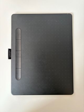 Tableta gráfica Wacom en color negro, ideal para diseño y dibujo digital. - Diseño elegante y compacto. - Superficie de dibujo con puntos de referencia. - Barra lateral con botones personalizables.