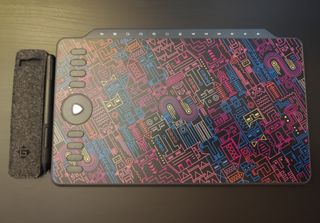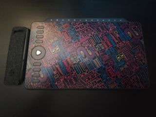 Tableta gráfica Gaomon M1220 con un diseño vibrante y moderno. - Superficie de dibujo con patrón geométrico multicolor. - Incluye lápiz y funda protectora. - Botones personalizables en el lateral.