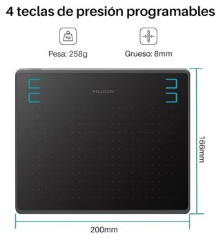 HUION HS64 Tableta Gráfica de Dibujo, con Stylus PW100 sin Batería, 4 Teclas Express Personalizadas para Principiantes, Tableta con Lápiz de 6,3 x 4 Pulgadas para Mac, PC con Windows y Android ideal para dibujo digital, diseño y clases online directamente desde el ordenador. Compacta, ligera y muy precisa, perfecta tanto para principiantes como para uso profesional. Incluye: • Tableta gráfica HS64 • Lápiz • Cable conector USB para ordenador • Repuestos de puntas para el lápiz • 2 adaptadores de puerto USB a USB-C y Guante Compatible con programas de diseño y plataformas educativas. Lista para usar.