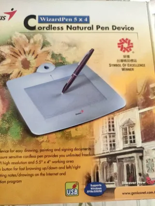 Tableta gráfica Genius WizardPen 5x4, ideal para dibujo y diseño. Viene en su caja original. - Dispositivo de bolígrafo natural inalámbrico. - 512 niveles de sensibilidad a la presión. - Área de trabajo de 5.5 x 4. - Alta resolución de hasta 4064 LPI. - Botón personalizable en el bolígrafo. - Compatible con Windows XP/Me/2000/98.