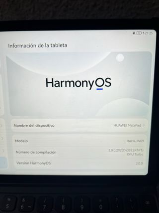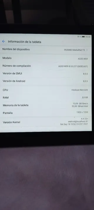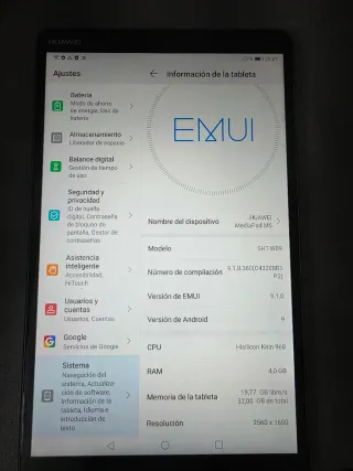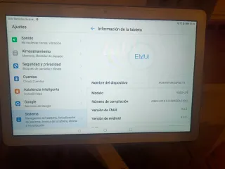 Tablet Huawei MediaPad T5. - Modelo: AGS2-W09 - Versión de EMUI: 8.0.0 - Versión de Android: 8.0.0 - CPU: Hisilicon Kirin 659