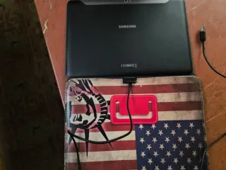 Tablet Samsung en color negro, acompañada de una funda con diseño de la bandera de Estados Unidos. - Funda con soporte integrado. - Cable de carga incluido.