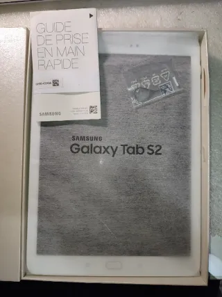 Tablet Samsung Galaxy Tab S2 en caja. - Incluye tablet, funda y pantalla protectora, cable USB y manuales. - Color negro.