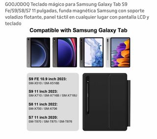 Funda magnética con teclado para Samsung Galaxy Tab S9, S9 FE, S8 y S7 de 11 pulgadas. Incluye soporte flotante y panel táctil. - Diseño magnético. - Soporte flotante. - Panel táctil integrado. - Compatible con pantallas LCD.