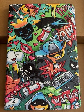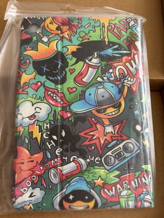 Funda para tablet con un diseño vibrante y llamativo de graffiti. - Compatible con Samsung Galaxy A11+. - Estampado de estilo urbano con spray, calaveras y personajes. - Colores vivos y dinámicos.