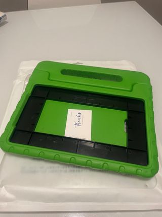 Funda protectora de color verde para tablet Samsung Galaxy. Tengo 2 iguales. Diseñada para ofrecer seguridad y fácil agarre. - Material resistente. - Asa integrada para transporte. - Diseño con bordes reforzados.