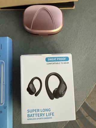 Tablet Samsung Galaxy Tab A en color blanco, junto con varios accesorios. - Funda protectora azul. - Protector de pantalla Glass Pro. - Soporte universal para tablet. - Auriculares inalámbricos. - Cargador portátil rosa.