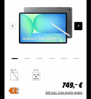 Tablet Samsung Galaxy Tab S10 FE+ en color gris. - Pantalla de 10.4 pulgadas. - Incluye S Pen. - Cargador USB PD de 15-45W.