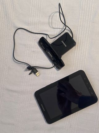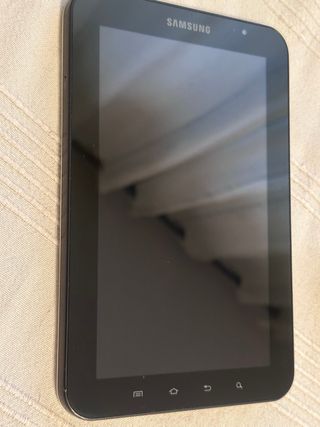 Tablet Samsung Galaxy Tab en color blanco. Está en buen estado, unico problema que por la funda que tenia puesta se ha puesto un poco amarilla por detras, pero si se limpia en condiciones se debe quitar. - Modelo Samsung Galaxy Tab (el modelo exacto puede confirmarse con las imágenes). - Pantalla en perfecto estado.