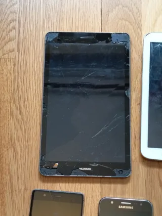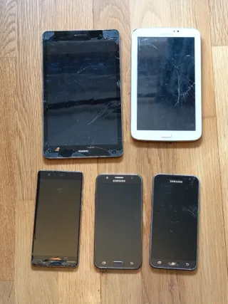 Lote de 3 móviles y 2 tablets estropeados para usar piezas o reparación. Tal cual están en las fotos. Ver bien fotos. Pantallas rotas, pero pueden servir para piezas interiores, como cámaras, sensores, baterías... - Tablet Samsung: SM-T210, 8GB. - Tablet Huawei: KOB-L09 - Móvil Samsung: SM-J500FN - Móvil Samsung: SM-J320FN - Móvil Huawei: EVA-LC9 Venta del Lote Completo. No vendo dispositivos independientes. *** MIRA OTROS PRODUCTOS DE MI PERFIL. CREA UN LOTE Y AHORRA EN GASTOS DE ENVÍO ***
