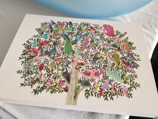 Tableta gráfica Wacom Intuos Pro con un diseño circular lleno de pájaros y ramas. - Modelo: Intuos Pro. - Diseño artístico circular.