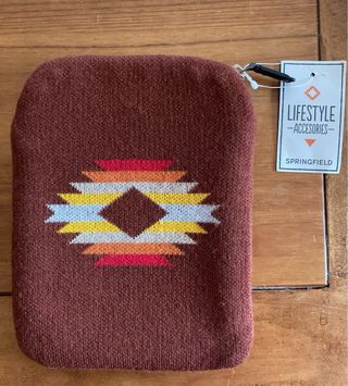 Funda para tablet con un diseño geométrico en tonos tierra. Es de punto y protege tu dispositivo con estilo. - Diseño geométrico central. - Tejido de punto. - Color marrón.