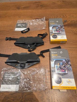 Vendo 2 soportes para móvil / tablet de coche de la marca Targus. Permiten fijar la tablet para que la vean desde el asiento trasero, desde 7 pulgadas a 10,1 pulgadas, en perfecto estado. Fácil instalación en el cabecero del asiento delantero. Todo en su embalaje original, instrucciones,... Precio 1 unidad 20 euros, las 2 unidades 30 euros.