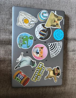 Portátil Primux 1302 en buen estado, listo para usar. La carcasa está decorada con varias pegatinas. - Pantalla de 13 pulgadas. - Diseño moderno y ligero. - Incluye cargador. - Se hace tablet