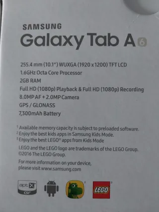 Tablet Samsung en color blanco. - Pantalla de 9.7 pulgadas. - Procesador Quad-Core. - 16 GB de almacenamiento interno. - Cámara trasera de 5 MP y frontal de 2 MP. - Batería de 5870 mAh. Lo único que le cuesta cargar si lo haces cuando le queda un 10% de batería, por el resto está bien, tiene su uso y desgaste de un niño para juegos. Restablecida de fabrica para ponerla para ti. La raja en el cristal es del protector.