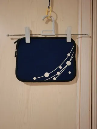 Funda protectora de color azul oscuro para tablet. Presenta un diseño decorativo en la parte frontal. - Material textil. - Cierre de cremallera, para ambos lados. - Diseño de líneas blancas y círculos.