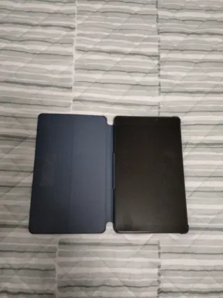 Tablet con funda protectora. - Funda de color azul. - Pantalla negra.