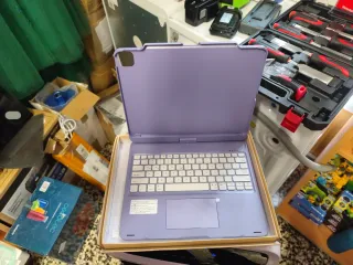 Funda protectora para tablet con teclado integrado en color morado. - Diseño elegante y funcional. - Teclado con disposición QWERTY. - Trackpad integrado.