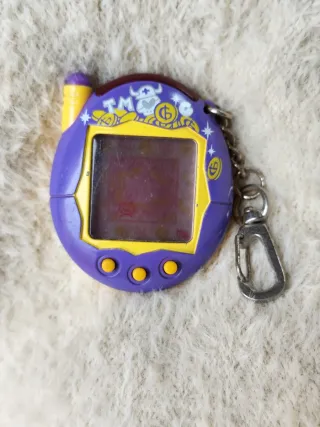 Tamagotchi original con su cadena metálica. - Diseño ovalado. - Pantalla con personaje pixelado. - Botones inferiores de color morado.