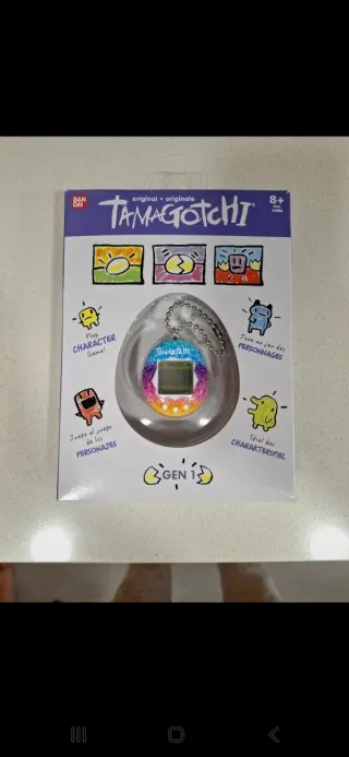Tamagotchi Gen 1 original de Bandai con un diseño de carcasa arcoíris brillante. Este dispositivo portátil te permite cuidar de tu mascota virtual. - Diseño de carcasa arcoíris. - Incluye llavero para llevarlo contigo. - Juego de personajes.