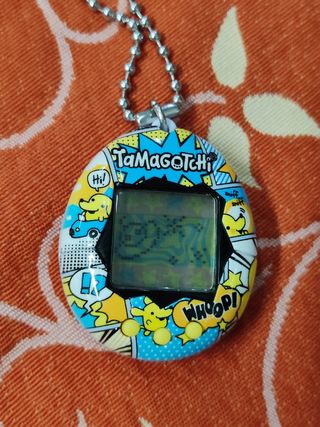 Tamagotchi original con un diseño inspirado en cómics. - Diseño de cómic con personajes y onomatopeyas. - Llavero de cadena metálica.