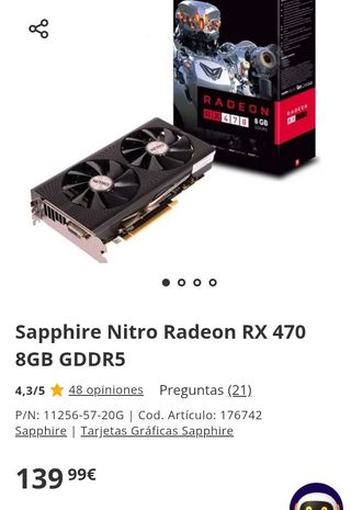Tarjeta gráfica Sapphire Nitro Radeon RX 470 con 8 GB GDDR5, diseñada para gaming en 1080p con buen rendimiento en títulos modernos y compatibilidad con APIs como DirectX 12 y Vulkan. Cuenta con doble ventilador para una refrigeración eficiente y silenciosa, salidas HDMI, DisplayPort y DVI-D, soporte para múltiples monitores. Frecuencia base de 1206 MHz, bus de 256 bits y ancho de banda de memoria de 211 GB/s. Estado nuevo, revisado visualmente sin daños ni desgaste. Ideal para montar un PC de juegos o actualizar un equipo existente con buena relación calidad/rendimiento.
