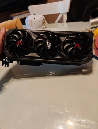 Tarjeta gráfica Radeon RX 6600XT con diseño de doble ventilador. - Ventiladores de alta eficiencia. - Diseño moderno y compacto. - No da video, no se qué le pasa estaba perfecta funcionaba muy bien nunca me dió ningún problema, se le cambió la pasta térmica y dejó de funcionar, enciende inicia ventilador pero se para y no da video, se vende como averiada no se admite devolución.