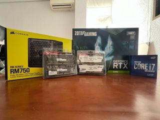 Pack de componentes para PC Gaming. - Tarjeta gráfica Zotac Gaming GeForce RTX 3080 Trinity OC. - Procesador Intel Core i7 10700K Unlocked. - Memoria RAM T-Force Delta RGB DDR4 3200 mhz (2x8GB). - Memoria RAM T-Force Dark Z DDR4 3200 mhz (2x16GB). - Fuente de alimentación Corsair RM750. Comprados en Marzo 2022 en PC componentes, se vende por actualización del sistema.